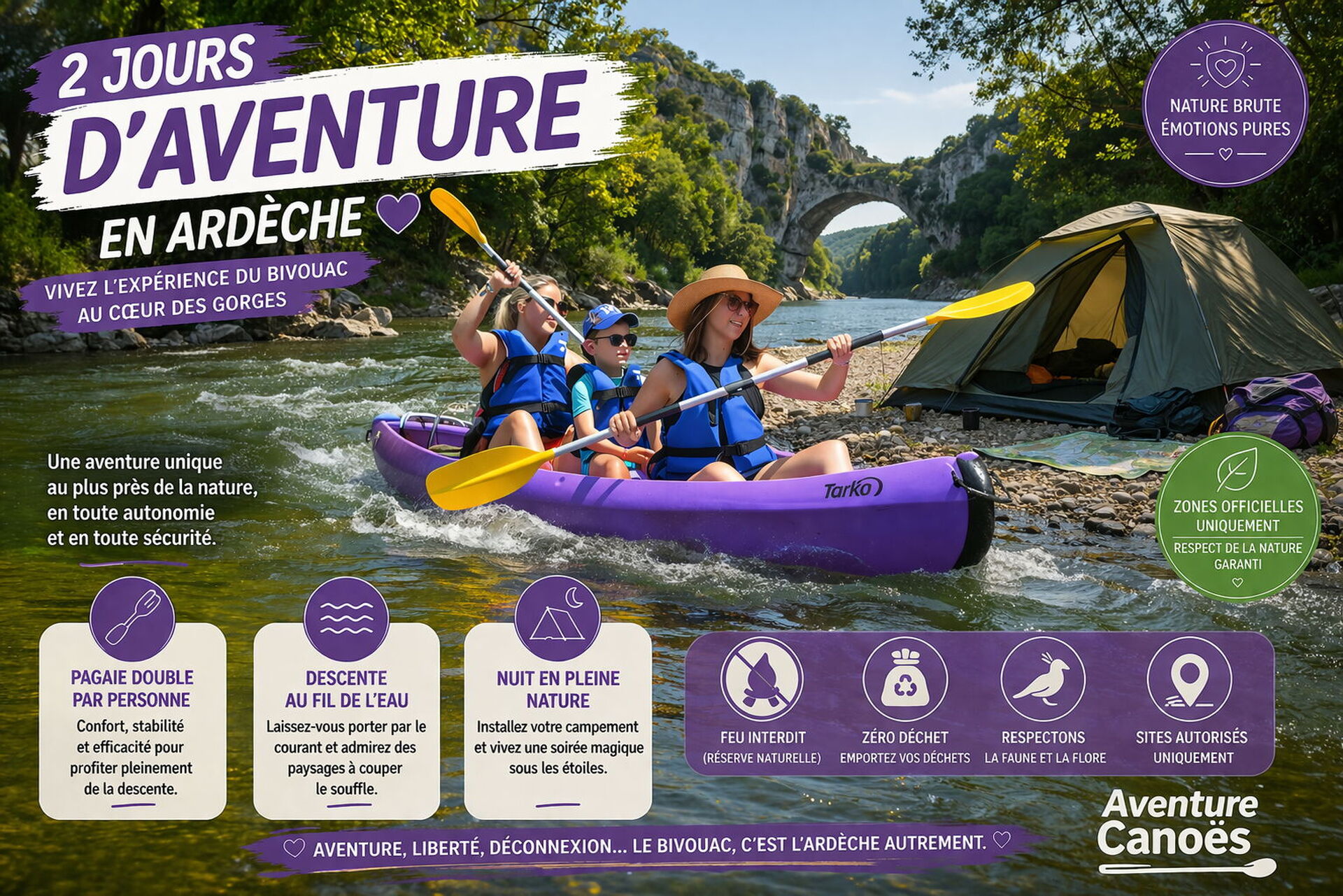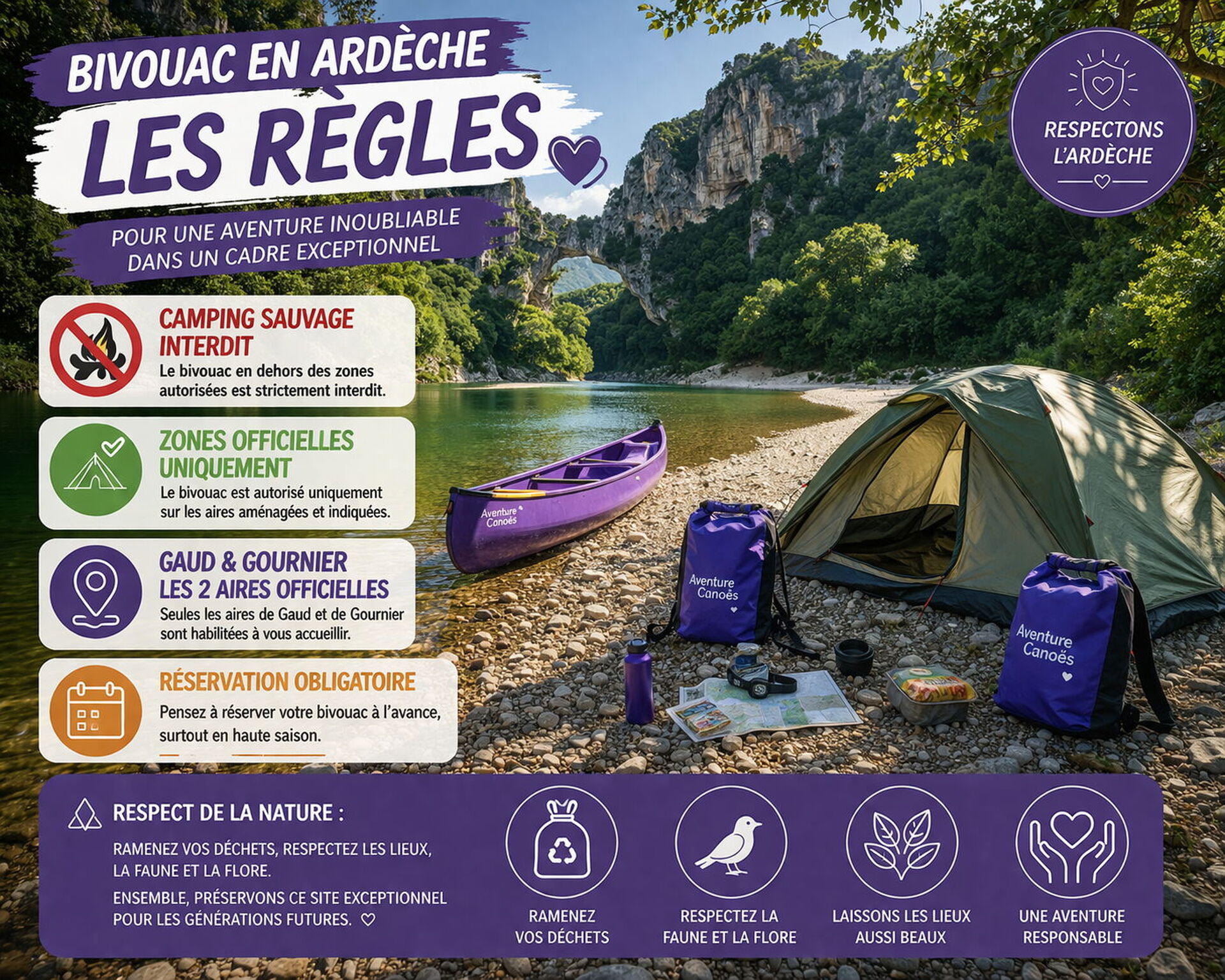 La réserve naturelle interdit strictement tout bivouac sauvage sur l'ensemble du parcours. Gaud et Gournier sont les deux seuls spots autorisés pour dormir dans les gorges. Toute nuitée en dehors de ces aires expose à des poursuites administratives.Faut-il réserver le bivouac séparément de la location de canoë ?