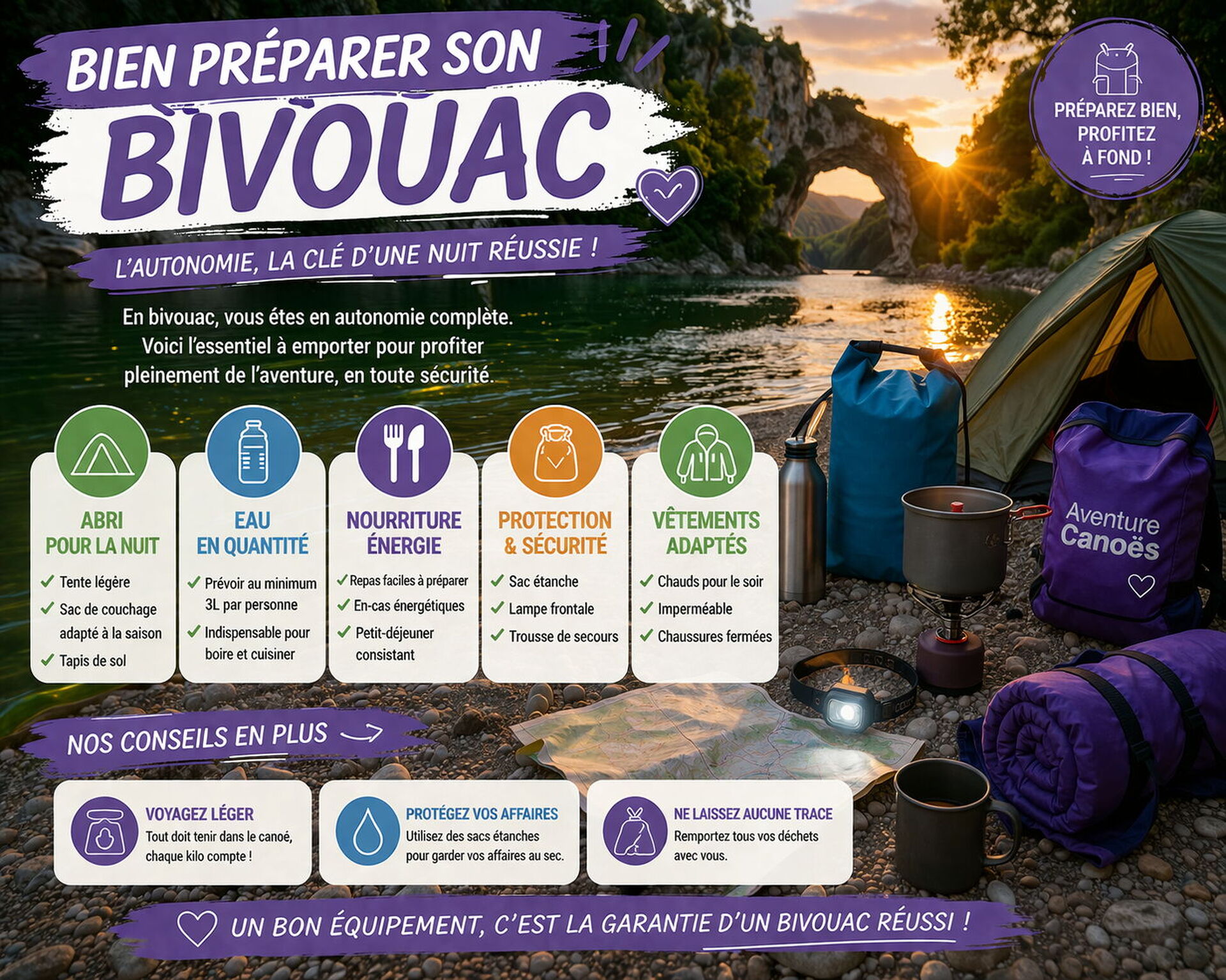 Le bivouac dans les gorges de l'Ardèche se prépare bien, mais il ne se complique pas. Avec le bon matériel, une réservation faite à l'avance et les règles de la réserve respectées, votre séjour se vit pleinement : deux jours hors du temps, dans l'un des plus beaux espaces naturels de France.