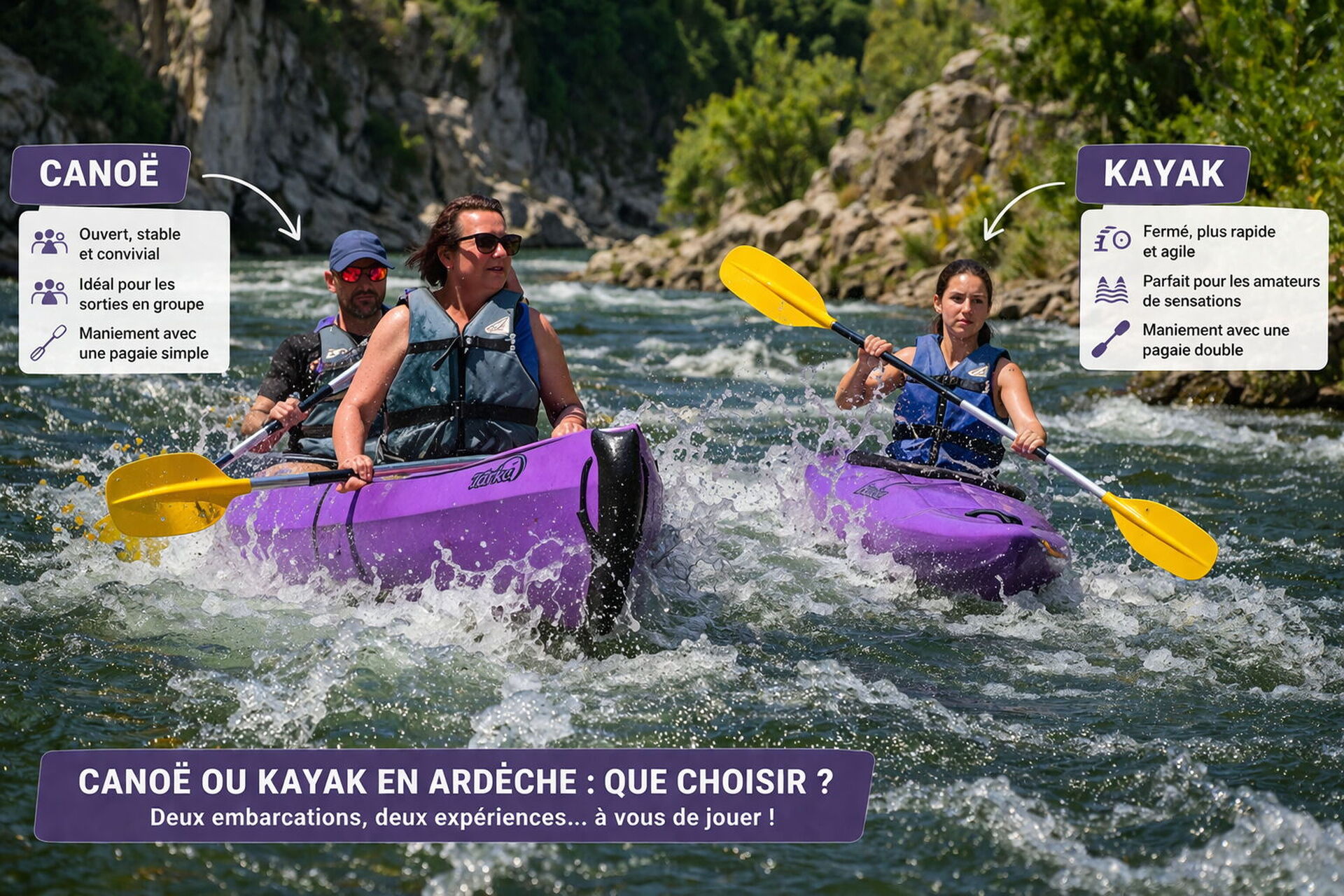 Et c'est une bonne question. Parce-que sur la rivière Ardèche, avec ses rapides, ses toboggans, ses passages sous l'arche du Pont-d'Arc et ses plages secrètes au fond des gorges, le choix de l'embarcation conditionne toute l'expérience.