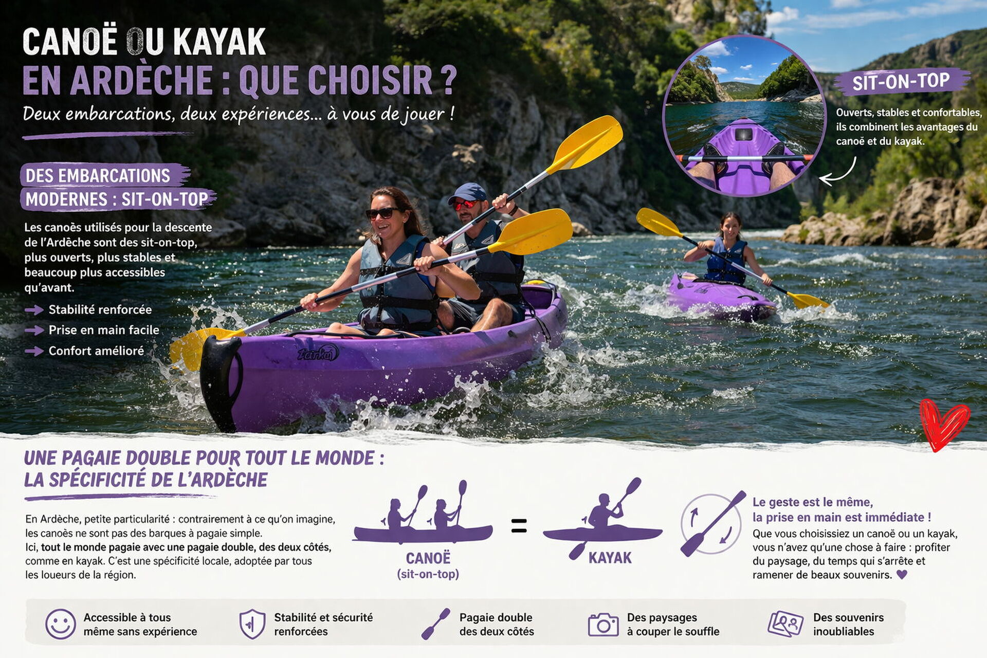 Une descente en Ardèche peut durer plusieurs heures, parfois toute la journée. Le confort devient alors essentiel.🚫Choisir uniquement en fonction de l’image que nous avons du kayak ou du canoë