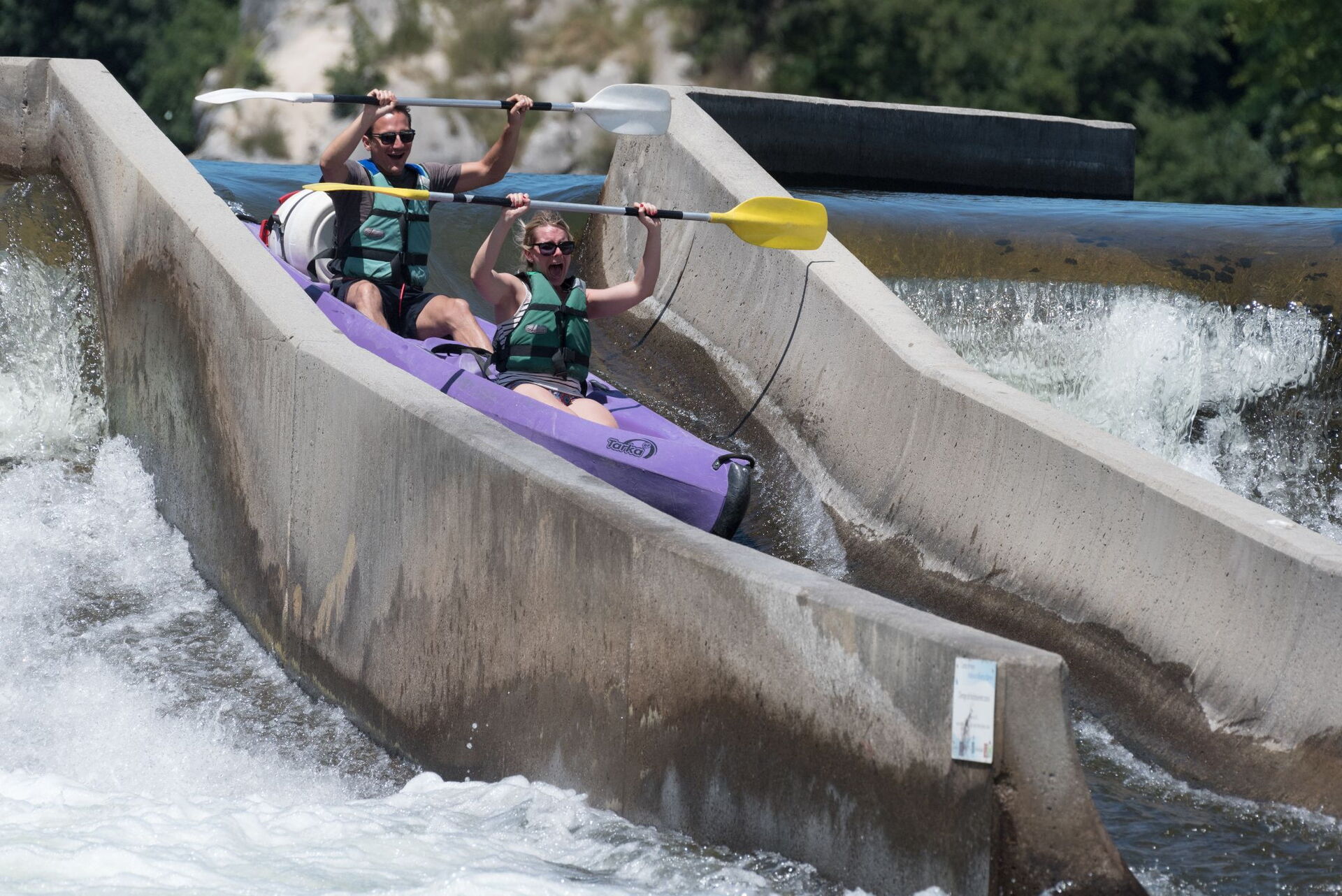 Départ de Sampzon pour une descente calme jusqu'à notre base, 1h30 plus bas. Un parcours sans rapides, parfaitement adapté aux débutants, avec 4 toboggans aménagés, très amusants à franchir.