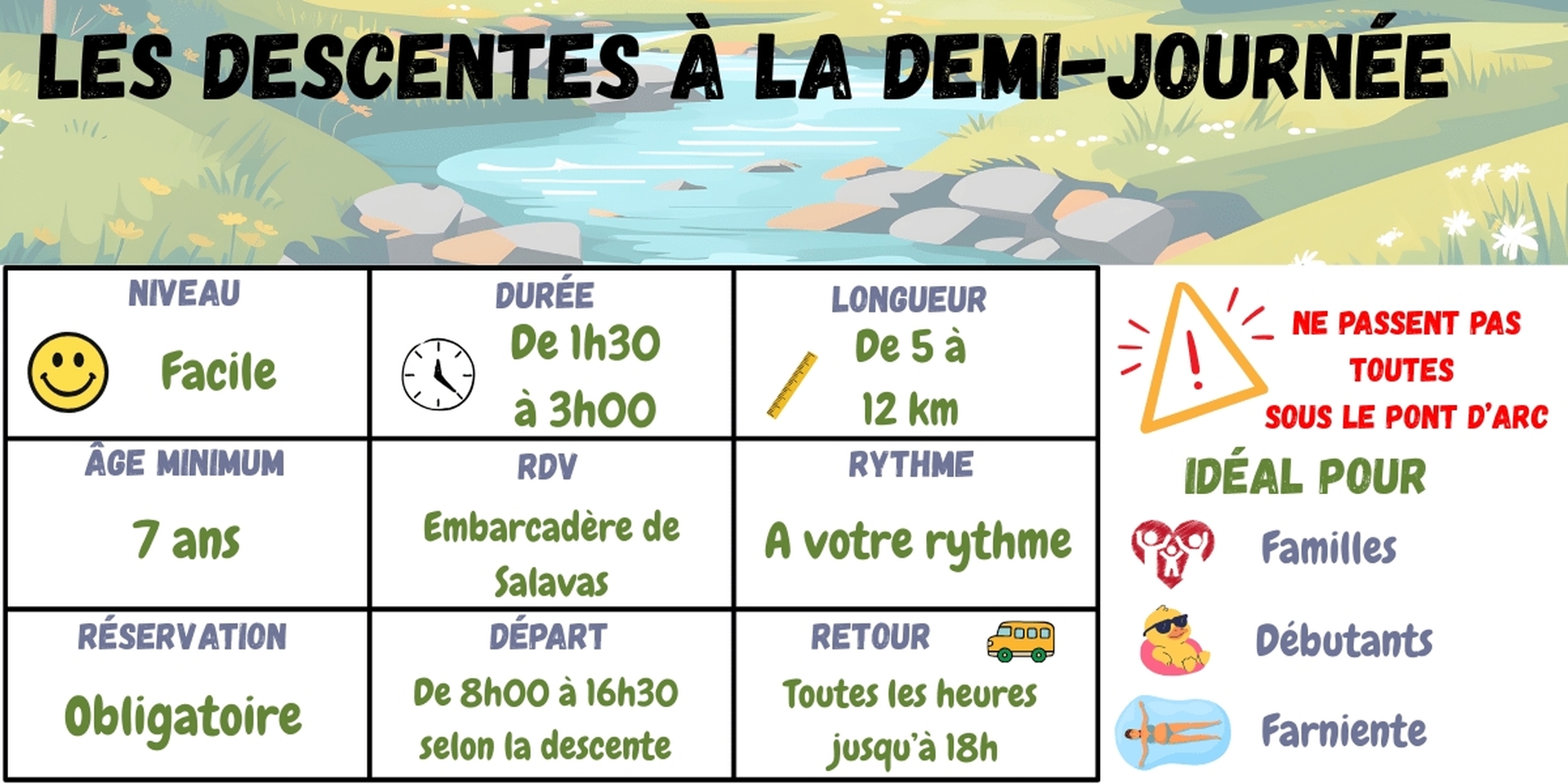 Idéal pour : familles, débutants, découverte du Pont d’Arc- Durée moyenne : 1h30
